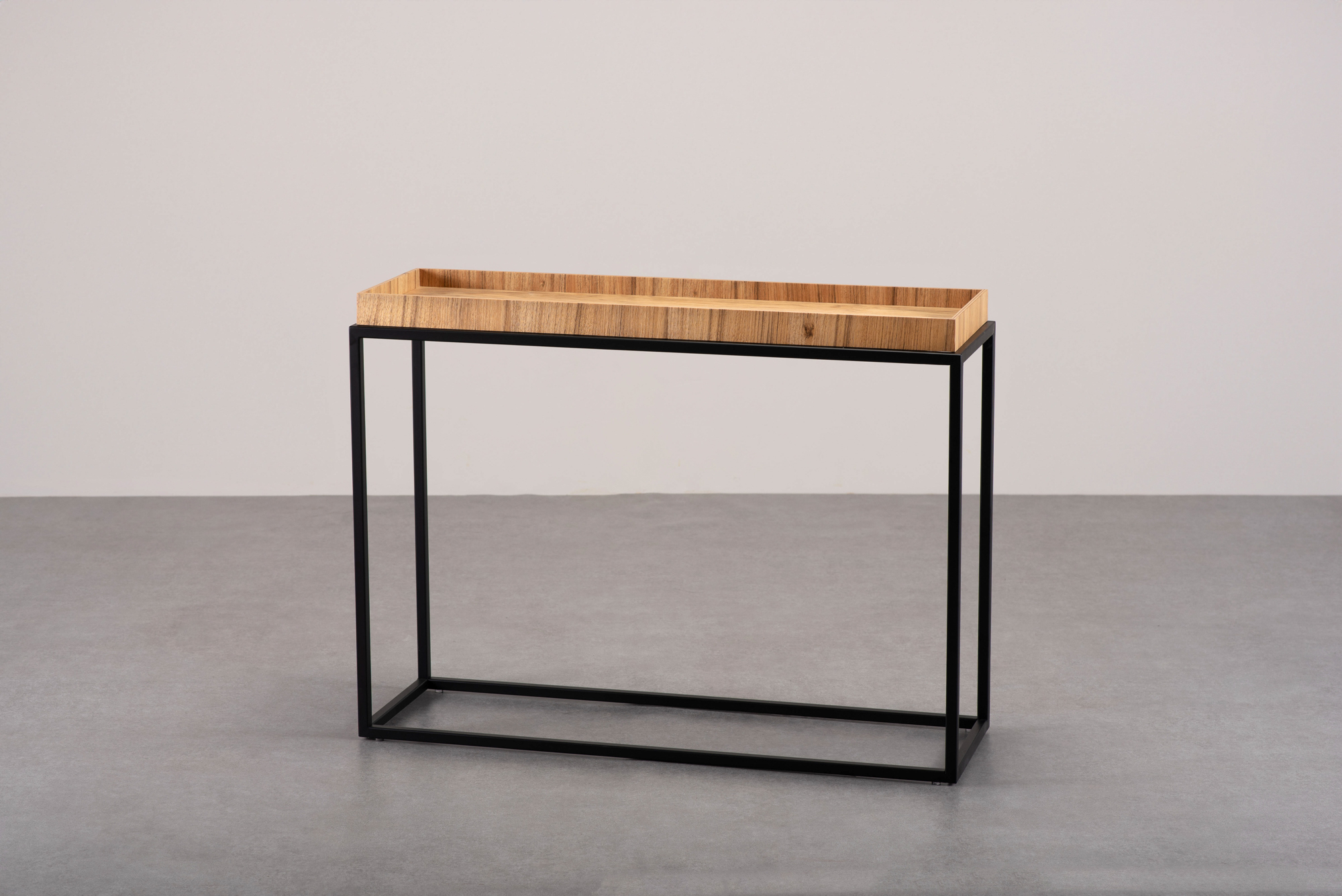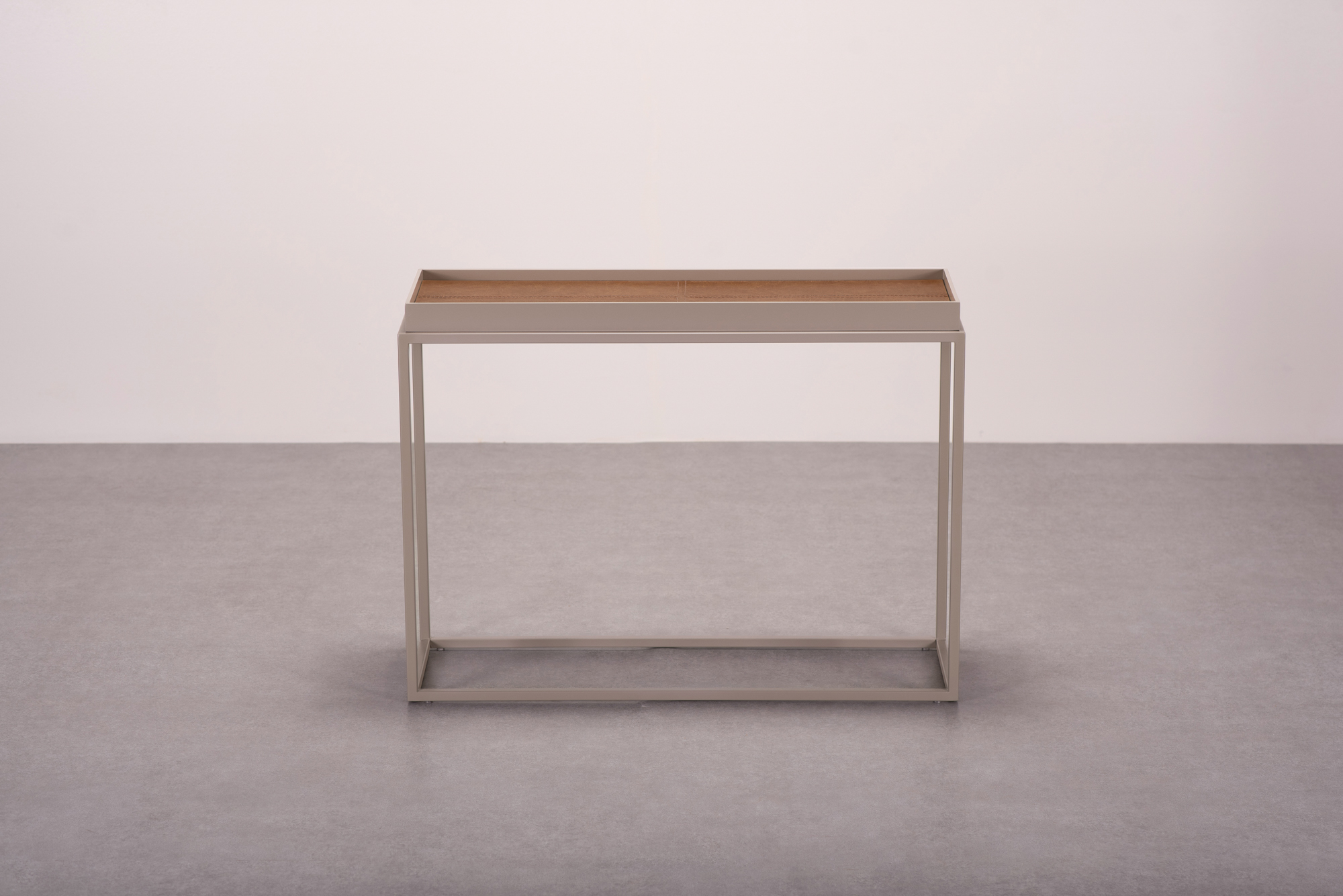Mesa lateral com tampo tipo bandeja, laminado ou laqueado, com fundo em espelho ou recouro. Estrutura em aço carbono pintado.